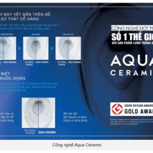 - Công nghệ Aqua Ceramic chống bám bẩn: Hạn chế tối đa sự hình thành vệt ố vàng trên bề mặt sứ, giúp sản phẩm luôn sáng bóng. Lớp màng phủ đặc biệt có khả năng làm tăng sức căng bề mặt nước, ngăn chặn các giọt nước đọng lại, giúp hạt cặn Silic không thể bám vào bề mặt men sứ, từ đó giảm tần suất vệ sinh và hạn chế sử dụng hóa chất tẩy rửa.