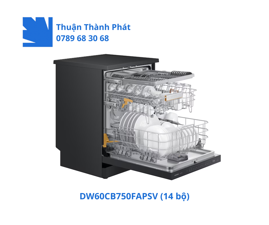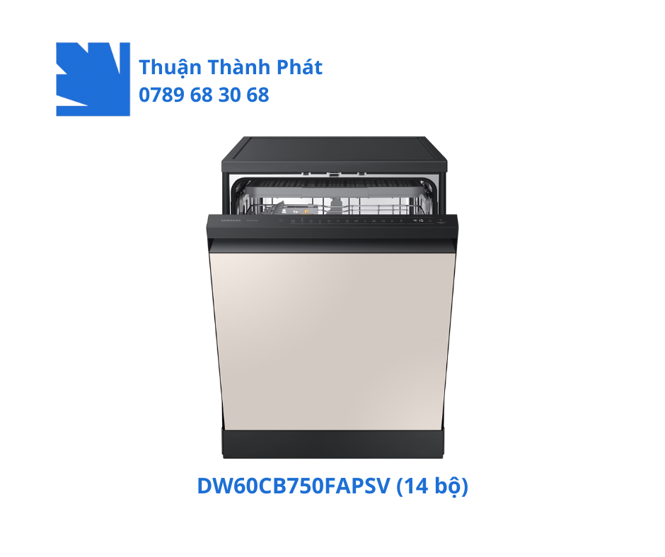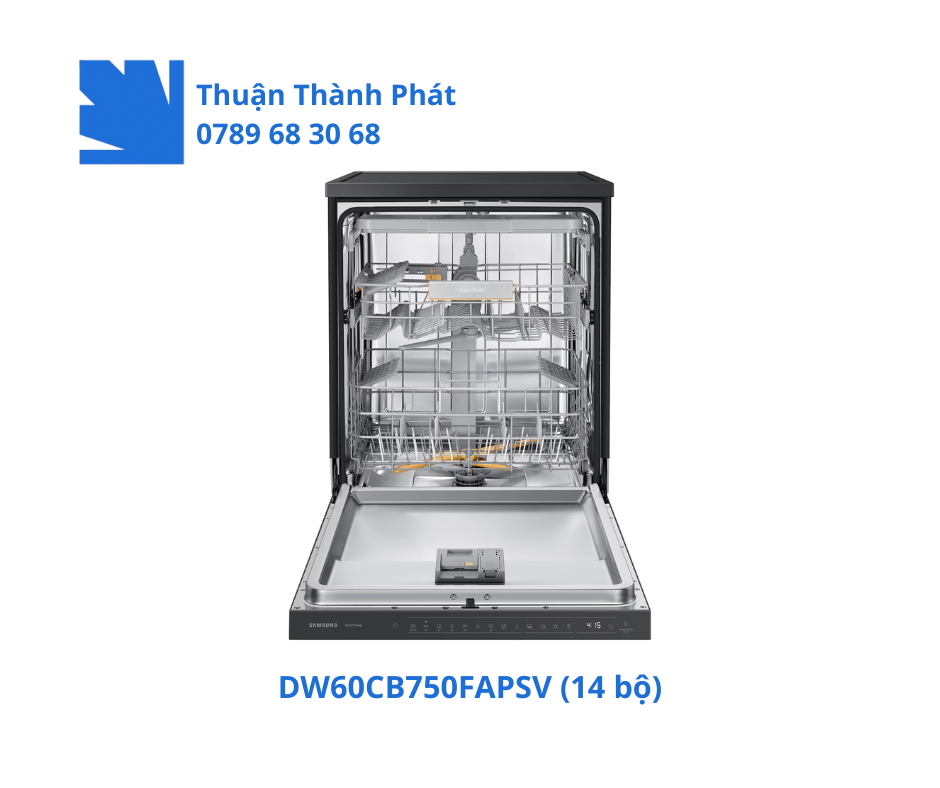 Máy rửa bát DW60CB750FAPSV – dòng Bespoke cao cấp của Samsung với sức chứa 14 bộ, rửa xoáy kép Water Jet Clean™, sấy khô tự động, diệt khuẩn Hygiene Plus, điều khiển thông minh qua SmartThings và vận hành êm ái chỉ 40 dB. Thiết kế tinh tế, phù hợp với mọi không gian bếp hiện đại.